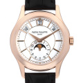 - ムーンフェイズと2月末以外は調整不要なアニュアル(年次)カレンダーを備えたモデル「5205」。文字盤の上部に配置された小窓で曜日・日付・月を表示し、6時位置には月の満ち欠けを表すムーンフェイズ表示と24時間計が配置されております。シースルーバックからは特許取得の独創的なパテックフィリップ年次カレンダー機構を備えた自動巻ムーブメントを眺めることができます。