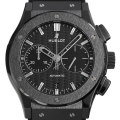 - ウブロが掲げる“フュージョン・コンセプト”と“クラシックシリーズ”が融合して生まれたのが“クラシック フュージョン”コレクションです。こちらはケース、ダイアル、ベゼル、ベルトをすべてブラックで統一したクールなモデルです。ムーブメントには、HUB1143自動巻きクロノグラフを搭載。針とインデックスのシルバーとダイアルのブラックのコントラストで視認性抜群です。
