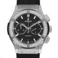 - 人気が高いクラシック・フュージョンのクロノグラフモデルです。こちらはベゼルに126個のダイヤモンドをセッティングしたモデルです。ブラックフェイスにシルバーのハンド&インデックスの組み合わせが、視認性が高く落ち着いた雰囲気の2つ目クロノグラフです。バックスケルトンからは、HUB1143自動巻きムーブメントの精巧な動きをじっくりとご堪能いただけます。チタンケースの為軽く装着感も良い時計です。パワーリザーブ42時間。