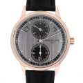 - 2019年に発売された高い機能性と個性を併せ持つ新作、レギュレーターモデルが入荷いたしました。時針、分針、秒針がそれぞれ独立したサブダイヤルに表示されるため、各針が重なることがな視認性が高いです。また、搭載している年次カレンダーは毎年3月1日に日付修正をするだけで、あとは日付を修正する必要がありません。ケースサイドのプッシュボタンを押すことで簡単に操作できます。ローズゴールド製のケースにグラファイトとブラックのダイアルが上品で気高さを感じさせるデザインです。