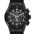 - クラシックフュージョンのクロノグラフをスケルトン加工したモデルです。ケースやベゼルにブラックセラミックを使用、文字盤も黒色に統一しています。クラシック フュージョンのシンプルさとウブロらしいメカニカルなデザインが一度に楽しめるお薦めの一本です。ムーブメントにはCal.HUB1155を搭載。50m防水。