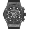 - クラシックフュージョンのクロノグラフをスケルトン加工したモデルです。ケースやベゼルにブラックセラミックを使用、文字盤も黒色に統一しています。クラシック フュージョンのシンプルさとウブロらしいメカニカルなデザインが一度に楽しめるお薦めの一本です。