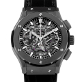 - クラシックフュージョンのクロノグラフをスケルトン加工したモデルです。ケースやベゼルにブラックセラミックを使用、文字盤も黒色に統一しています。クラシック フュージョンのシンプルさとウブロらしいメカニカルなデザインが一度に楽しめるお薦めの一本です。ムーブメントにはCal.HUB1155を搭載。50m防水。