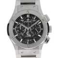- ウブロが掲げるフュージョン・コンセプトとクラシックシリーズが融合して生まれたクラシック フュージョン。こちらは素材にチタンを採用し、ポリッシュ仕上げとサテン仕上げを組み合わせた意匠のモデルです。ブレスタイプですが見た目ほど重さを感じさせないのもチタンの特徴です。ダイアルはスケルトンになっており、裏と表両面から内部機構をご覧いただけます。