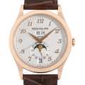 - 2016年、"アニュアルカレンダー"誕生20周年を記念して発表された「Ref.5396R-012」。前作に続きクラシックなブレゲ数字を採用しており、2019年に惜しまれつつ生産終了となっています。12時位置の曜日・月の二重表示窓、6時位置の日付表示窓、さらにムーンフェイズを組み込んだ24時間表示サブダイアルを備えた、年次カレンダー機構を搭載。月末が30日と31日の違いを自動で判別し、年に一度、2月末のみ手動調整を要するという高度な複雑機構です。ケースには、肌馴染みの良い柔らかな輝きの18Kローズゴールドを採用。艶やかなシルバーオパーリンダイアルとゴールド植字のブレゲ数字が気品を添えます。