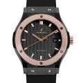 - ウブロが掲げる”フュージョン・コンセプト”と”クラシックシリーズ”が融合して生まれたクラシックフュージョン。こちらのモデルはブラックセラミックケースにブラックカーボンの文字盤、ローズゴールドベゼルというクールなブラック基調のデザインです。様々な素材が組み合わさりながら上品な仕上がりとなっているモデルです。