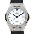 - 大ヒット作ビッグバンから始まったウブロの新しいコンセプトクラシックフュージョン。こちらはブルーのインデックスと三針が美しく映える、艶やかなラッカーを用いたホワイト文字盤の日本限定モデルです。端正なデザインながらも衝撃に強いチタンを使用しているため、エレガントさとスポーティーな雰囲気を両立しています。自動巻きCal.HUB1100を搭載。パワーリザーブ約42時間。5気圧防水。