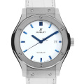 - 大ヒット作ビッグバンから始まったウブロの新しいコンセプトクラシックフュージョン。こちらはブルーのインデックスと三針が美しく映える、艶やかなラッカーを用いたホワイト文字盤の日本限定モデルです。端正なデザインながらも衝撃に強いチタンを使用しているため、エレガントさとスポーティーな雰囲気を両立しています。自動巻きCal.HUB1100を搭載。パワーリザーブ約42時間。5気圧防水。