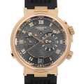 - フランス海軍のマリンクロノメーター(航海用精密時計)の製造者として「アブラアン・ルイ・ブレゲ」が築きあげた偉大な遺産からヒントを得たマリーンウォッチ。こちらのモデルは2018年に発表された第三モデル、アラーム機能を搭載しています。コインエッジのローズゴールドケースにギョーシェ装飾のグレーダイアル、ブレゲ針等ブレゲ伝統のクラシカルなデザインが映える1本です。