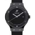 - ケースとベゼルには、軽量で堅牢なブラックセラミックを用い、その上にウブロを象徴するH字型のチタニウム製ビスが配置されています。文字盤には艶やかなブラックラッカー仕上げが施されており、ミニマルでありながら存在感のある表情を演出しています。ウブロ創業時の初代モデルにインスピレーションを受けてデザインされており、伝統的なエレガンスと現代的なスポーティーさが絶妙に融合した、時代を超えて愛用できる一本に仕上がっています。