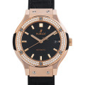 - ウブロが掲げる“フュージョン・コンセプト”と”クラシック”コレクションが融合して生まれた“クラシック フュージョン”。こちらのモデルはベゼルに138個のダイヤモンド(約1.12ct)を備えており、高級感あふれる仕上がりです。ケース素材として用いられているキングゴールドは、レッドゴールドに約5%のプラチナを配合したウブロ独自の素材です。ゴールドケースでは避けられない経年変化による変色が起こりにくくなっています。