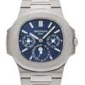 - 2018年発表の「5740/1G-001」は、シリーズ初となるグランドコンプリケーションモデルです。ノーチラス初の永久カレンダー機構を搭載。ダイアルには従来のブラックやブルーではなく、落ち着いた色合いを放つブルー・ソレイユ仕上げが採用されており、18Kホワイトゴールド製のケースが格別な品格を漂わせています。永久カレンダー機構を搭載しながらもわずか8.42mmしかない薄型設計です。