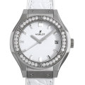 - ウブロが掲げる“フュージョン・コンセプト”と”クラシック”コレクションが融合して生まれた“クラシック フュージョン”。こちらは33mmのケースにチタンを使用し、女性らしいホワイトの文字盤とベゼルに設置された36個のダイヤモンドが手元を華やかに飾ってくれます。ベルトには柔軟性に優れたラバー素材を使用しており、実用性と高級感の両方を追求したモデルとなっております。