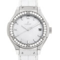 - ウブロが掲げる“フュージョン・コンセプト”と”クラシック”コレクションが融合して生まれた“クラシック フュージョン”。こちらは33mmのケースにチタンを使用し、女性らしいホワイトの文字盤とベゼルに設置された36個のダイヤモンドが手元を華やかに飾ってくれます。ベルトには柔軟性に優れたラバー素材を使用しており、実用性と高級感の両方を追求したモデルとなっております。