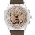 - 世界を飛び回る旅行者のために製作された時計であり、2016年に発表された「ワールドタイム フライバック クロノグラフ」からシリーズ初となるステンレスモデルが入荷いたしました。10時位置のプッシュボタンを押すだけで文字盤上の都市名外周リング、24時間表示の内周リング、ローカルタイムを示す時分針が操作され、ローカルタイムと世界24都市の時間を同時に表示することが出来、クロノグラフをも搭載した渾身のコンプリケーション。ヴィンテージ感を醸し出すローズゴールドメッキの文字盤は、美しいカーボンモチーフのギョーシェ装飾が施されています。パワーリザーブ最大55時間。