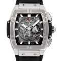 - トノー型ケースが特徴的なスピリット・オブ・ビッグバン。エル・プリメロをベースにしたムーブメントHUB4700を搭載したモデルです。ダイヤルとケースバックがシースルーになっているため、その精密な動きをご覧頂けます。ケース径51mm×45mmのビッグケースですが、素材にチタニウムを使用しているので、着けやすい重さになっています。パワーリザーブ約50時間。100m防水。