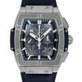 - トノー型ケースが特徴的なスピリット オブ ビッグバン。エルプリメロをベースにしたムーブメントHUB4700を搭載したモデルです。ダイヤルとケースバックがシースルーになっているため、その精密な動きをご覧頂けます。ケース径51mm×45mmのビッグケースですが、素材にチタニウムを使用しているので、着けやすい重さになっています。パワーリザーブ約50時間。100m防水。