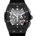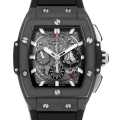 - トノー型ケースが特徴的な「スピリット・オブ・ビッグバン」。ケースには傷の付きにくいセラミックを採用したオールブラック仕様です。ムーブメントはエル・プリメロから作られた「HUB4700」を搭載。