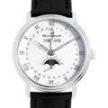 - ブランパンの生誕地を名にもつ「ヴィルレコレクション」。こちらは月・日・曜日のトリプルカレンダー、6時位置にムーンフェイズを搭載したコンプリケーションモデルです。ブルースティールのスネークハンドで日付を示し、ダイアル中央にスペースをとり、さらに絶妙に配置することによって、表示の多さにもかかわらず視認性やドレスウォッチならではの落ち着いた雰囲気を醸し出しています。お月様の可愛らしい顔もデザインに緩急をつけています。3気圧防水。