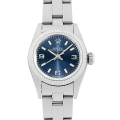- 金属塊から削りだした防水性の高いオイスターケースと、全回転式ローターを搭載したパーペチュアル機構を搭載した“オイスターパーペチュアル”。様々なバリエーションが存在しますが、こちらは控えめながら気品の滲み出るブルーダイアルで、3時・6時・9時にアラビア数字、他はバーインデックスが配置されたスタイリッシュなデザインです。