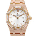 - オーデマ・ピゲを代表し、ラグジュアリースポーツウォッチの代名詞とも言える“ロイヤルオーク”。こちらはヘアライン仕上げケースとダイヤモンドを配したベゼルが華やかなモデルです。時計としての機能はシンプルですが、ピンクゴールドとダイヤモンドの組み合わせが気品溢れるデザインです。