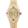 - レディースロレックスの中でも最高峰に位置するイエローゴールド製の"デイトジャスト"。様々なバリエーションが存在しますが、こちらはシャンパンゴールドのダイアルに10粒のダイヤモンド、ベゼルに32個のダイヤと4個のルビーをセッティングした、高級感溢れる華やかなデザインです。他のデイトジャストではあまり見かけることのないゴージャスな装飾が施されており、人とは違った存在感ある特別な1本をお探しの方にお勧めです。