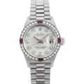 - 1945年に誕生し、今やレディースロレックスの顔とも言える"デイトジャスト"。金属塊から削りだした防水性の高いオイスターケース、午前0時頃瞬時に日付けが変わるデイトジャスト機構、全回転式ローターを搭載したパーペチュアル機構と、ロレックス三大機構を搭載したモデルです。様々なバリエーションがありますが、こちらはケース・ブレスともにホワイトゴールドを使用し、シルバーダイヤルに10個のダイヤモンド、ベゼルに32個のダイヤと4個のルビーをセッティングした、贅沢ながらも上品なデザインです。