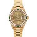 - 男女問わず永遠のステータスシンボルとも言えるロレックスのデイトジャスト。こちらはベゼルに32粒のダイヤモンド、4粒のエメラルドを備えたゴージャスなモデルです。ケース、ブレスにはイエローゴールドを使用し、インデックスにもダイヤを配しています。既に生産は終了しており、なかなか見かけないモデルです。