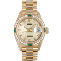 - 男女問わず永遠のステータスシンボルとも言えるロレックスの“デイトジャスト”。こちらはベゼルに32粒のダイヤモンド、4粒のエメラルドを備えたゴージャスなモデルです。ケース、ブレスにはイエローゴールドを使用し、“ROLEX”の文字が彫り込まれたダイアル上には10ポイントのダイヤインデックスがセッティングされています。