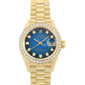 - ロレックスのレディースモデルの中でも最高峰に位置するイエローゴールド製の“デイトジャスト”。こちらは中心部から外周にかけて、ダイアルの色がブルーから深いブラックへと変化していく「ブルーグラデーションダイアル」を備えています。ダイヤインデックスがブラックカラー上に配されているため、ダイヤモンドの光沢感がより一層際立ちます。また、ベゼルにも40個のダイヤモンドがセッティングされているため大変ゴージャスな逸品です。