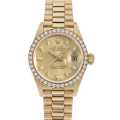 - ロレックスのレディースモデルの中でも最高峰に位置するイエローゴールド製のデイトジャスト。こちらはベゼルに40個、インデックスに10個のダイヤをセッティングした大変ゴージャスなモデルです。プレジデントブレスを採用することで、さらにラグジュアリーな雰囲気を醸し出しています。