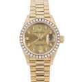- ロレックスのレディースモデルの中でも最高峰に位置するイエローゴールド製のデイトジャスト。こちらはベゼルに40個、インデックスに10個のダイヤをセッティングした大変ゴージャスなモデルです。シャンパンダイアルにプレジデントブレスを採用することで、さらにラグジュアリーな雰囲気を醸し出しています。