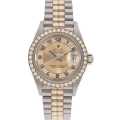 - ロレックスの三大機構(オイスターケース、パーペチュアル機構、デイトジャスト機構)を全て備えた”デイトジャスト”。1945年に誕生し、現在ではレディースロレックスの顔と言うべき存在になりました。ベゼルにダイヤモンドを敷き詰めダイアルにもミリヤードダイヤを配した、ラグジュアリーな雰囲気を醸し出しています。こちらはイエロー、ピンク、ホワイトの3色のゴールドを贅沢に使用した珍しい“トリドールブレスレット”を備えたモデルです。