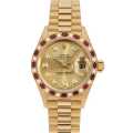 - 1945年にリリースされ、今やロレックスの顔とも言える“デイトジャスト”。ロレックス三大機構(金属塊から削りだした防水性の高いオイスターケース、午前0時頃瞬時に日付けが変わるデイトジャスト機構、全回転式ローターを搭載したパーペチュアル機構)を搭載したモデルです。こちらはベゼルにダイヤモンドとルビーを配し、プレジデントブレスを採用することでラグジュアリーな雰囲気を醸し出しています。