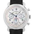 - ブラックとシルバーのコントラストが鮮やかな横目のクロノグラフです。フランクミュラーと言えばトノー型ケースやビザン数字のイメージが強いですが、直径44mmのラウンドケースに収められたこのモデルは、かつての独立時計師フランク・ミュラーの作品を象徴する、まさに源流というべきモデルです。