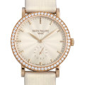 - パテックフィリップ永遠の定番カラトラバ。無駄の無い輪郭、端正な表情、滑らかな素材感などシンプルな洗練さを追求したこだわりが表現されいてる超薄型ウォッチです。こちらは文字盤にサンレイパターンを表現するギョーシェ加工を施し、ベゼルにダイヤモンドをセッティングした上品なモデルです。2010年に発表されましたが、惜しまれつつも生産終了しているレディースモデル。年代問わず特別な自分を演出してくれる一本ではないでしょうか。