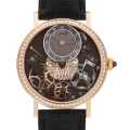 - 控えめなサイズで上品さを感じさせる文字盤には、美しいタヒチ産マザーオブパールを採用。その奥には手彫りの花模様をあしらった香箱が配され、繊細な機構美を楽しむことができます。シースルーバックからは、同様のフラワーモチーフが施されたローターを鑑賞でき、細部にまで一貫した美意識が貫かれています。ベゼルには68個(約0.895ct)、尾錠には25個(約0.13ct)のブリリアントカットダイヤモンドがセットされ、リューズにはムーブメントにも使用される人工ルビーを大胆にあしらっています。約50時間のパワーリザーブ表示も備え、ジュエリーと機械式時計の魅力を高次元で融合させたモデルです。