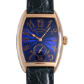 - フランクミュラーの中でも特に傑作と評価されるトノーカーベックス。中央から延びるように配された力強いアラビアインデックスもさることながら、うっとりしてしまうほど美しいギョーシェ彫りのブルーインデックス。ケースと尾錠はローズゴールドでとても上品なデザインです。