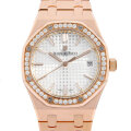 - オーデマピゲを代表し、ラグジュアリースポーツウォッチの代名詞とも言える“ロイヤルオーク”。多くの人気モデルを生み出してきた「ジェラルド・ジェンタ」氏によりデザインされ、1972年のファーストモデルから高い人気を誇るスポーツウォッチです。こちらは、初の34?自動巻きロイヤルオークになります。素材にはピンクゴールドを採用しており、シルバーカラーのグランドタペストリーダイアルの周囲を、ダイヤモンドセットベゼルが飾る高級感漂う華やかなデザインです。