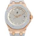 - 37mmのピンクゴールドケースに、グレーラバーで覆われたベゼルを組み合わせた、スポーティかつラグジュアリーなデザインが特徴の一本です。文字盤には、ロイヤルオークならではのグランド・タペストリー模様が施されたアイボリーカラーのギヨシェダイアルが採用されており、ピンクゴールドのインデックスと針が上品に輝いています。ムーブメントは、オーデマピゲ自社製のCal.5900を搭載。