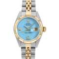 - 1945年に誕生し、今やレディースロレックスの顔とも言える“デイトジャスト”は、金属塊から削り出した防水性の高い「オイスターケース」、午前0時頃瞬時に日付けが変わる「デイトジャスト機構」、全回転式ローターを搭載した「パーペチュアル機構」と、ロレックス三大機構を搭載したモデルです。ベゼルには細かい山が装飾されたロレックス伝統のフルーテッドベゼルを採用しています。様々なデザインバリエーションが存在しますが、 こちらは鮮やかなブルーが目を惹く希少なブルージェダイト(翡翠)の文字盤です。6時と9時のインデックスにダイヤモンドが配されており、華やかながらも上品な仕上がりです。
