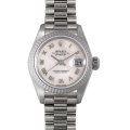 - 男女問わず永遠のステータスシンボルとも言えるロレックスの“デイトジャスト”。様々なバリエーションがありますが、その中でもいやらしさを感じさせず上品な光沢が特徴的なホワイトゴールド・シリーズです。こちらは ピンクシェル文字盤にデコレーション(格子模様)を施した希少性の高いモデルです。ゴールドの光沢にも負けないピンクシェルの柔らかな光沢感が魅力です。