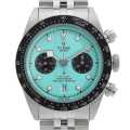 - "ブラックベイ クロノ"は、スポーツクロノグラフとダイバーズウォッチの魅力を融合させた1本です。2025年に登場したこちらは、鮮やかなターコイズブルーの文字盤にブラックのサブカウンターを組み合わせた「フラミンゴブルー」カラー。熱帯の水辺をイメージしたこの色合いは、視覚的なインパクトが強く、個性を際立たせます。自社製キャリバー「MT5813」を搭載。約70時間のパワーリザーブ。