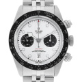 - 初代クロノグラフ誕生50周年を記念し発表された"ブラックベイ クロノ"。本モデルが採用している「T-fit クイックアジャストクラスプ」は、工具を使わずに簡単な操作で最大8mmの長さを5段階で調整することができます。搭載されるマニュファクチュールクロノグラフキャリバー「MT5813」は、時・分・秒表示に加え、クロノグラフと日付機能を備えています。他のチューダー製キャリバーと同様に独自の美しい仕上げが施されており、モノブロック構造のタングステン製ローターはオープンワークにサテンとサンドブラストを組み合わせ、ブリッジとメインプレートにはサンドブラストとレーザー装飾を交互にあしらったこだわりの仕上がりです。