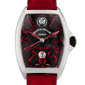 - 「日出づる国、日本」をイメージして作られたフランクミュラーの限定モデル“ライジングサン”。こちらは日本限定100本で発売されたモデルです。ギョーシェ彫りが施された黒文字盤に、真っ赤なインデックスが鮮烈な一本。日付窓の上には「Rising Sun」とモデル名が記されています。