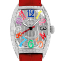 - ケース全体に班模様のエングレービングを施したアイアンクロコの入荷です。柄が規則的に連続して見える様に加工することで、まるでクロコの一枚革で時計を覆っている様な仕上がりです。シルバーの文字盤に色とりどりのアラビア数字が優雅に描かれており、フランクミュラーらしい個性溢れるデザイン。