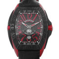 - 高度な技術力と美的な表現力が駆使されたコンキスタドールグランプリは、伝統的なトノー型ケースに、スポーティなアップライトインデックスや、レースカーのスピードメーターを彷彿とさせるホワイトとレッドで彩られたアグレッシブな針がセッティングされた、エレガントで男らしいモデルです。ケース素材としてF1や航空産業で使われる特殊合金「エルガ」を使用。耐久性と軽さの両立に成功しています。