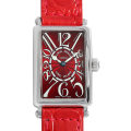 - フランクミュラーの豊富なコレクションの中でも、高い人気を誇るレクタンギュラーケースの“ロングアイランド”。こちらはダイアルとストラップをワインレッドで統一した“レッドカーペット”です。ダイヤル全面に広がるビザン数字やスペード型の時針など、1900年代初頭に一世を風靡したアールデコを髣髴とさせるクラシカルなデザインが特徴的です。