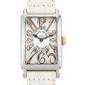 - フランクミュラーの豊富なコレクションの中でも、高い人気を誇るレクタンギュラーケースのロングアイランド。文字盤全面に広がるビザン数字やスペード型の時針など、1900年代初頭に一世を風靡したアールデコを髣髴とさせるクラシカルなデザインが特徴的です。ラグネジとリューズ、尾錠に18Kピンクゴールドが使われている、フランクミュラーとしては大変珍しいコンビネーションモデルです。ゴールドを控えめに使っているため派手すぎず上品な印象です。ダイヤルはミラー数字のレリーフダイヤルになります。
