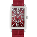 - フランクミュラーの豊富なコレクションの中でも、高い人気を誇るレクタンギュラーケースのロングアイランド。こちらはダイアルとストラップをワインレッドで統一したレッドカーペットです。ダイヤル全面に広がるビザン数字やスペード型の時針など、1900年代初頭に一世を風靡したアールデコを髣髴とさせるクラシカルなデザインが特徴的です。